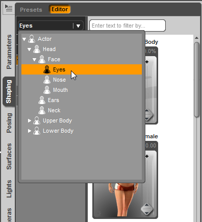 Parameters are aspects of Figures that allow the user to control the Figure in a variety of ways. All parameters show on the Parameters Tab, but to make DAZ Studio 4 more user-friendly, two additional tabs are provided which display subsets of the parameters: Posing and Shaping. These tabs also provide visual previews of the effect the control will have, if configured to do so. The Posing tab is typically used to display any parameter that moves parts of body via bones and weight maps. The Shaping tab contains controls for customizing shape of figure, typically by applying a morph target. By convention, Expression morphs are displayed on the Posing tab, even though they use morph targets, simply because customers associate expressions more with poses used to show a character in a particular position than with morphs which define a specific character.