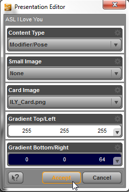 This allows us to specify how parameter is presented to user, including Content Type, icon images, and the gradient used on the controls. These values are saved in the dsf file.